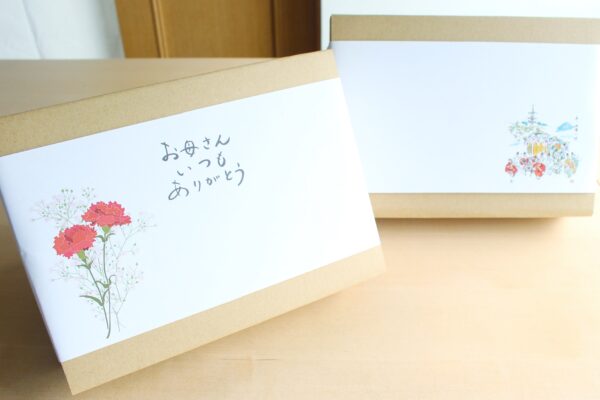 母の日用の限定掛け紙(お母さんありがとう柄)と、その他通常ギフト用の掛け紙(葵祭柄)の2種からお選びください。