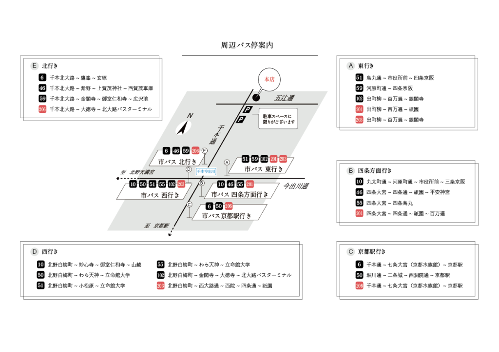 ※➀の東側駐車場は五辻の昆布の駐輪場ではございません。お停めにならないよう、ご注意くださいませ。