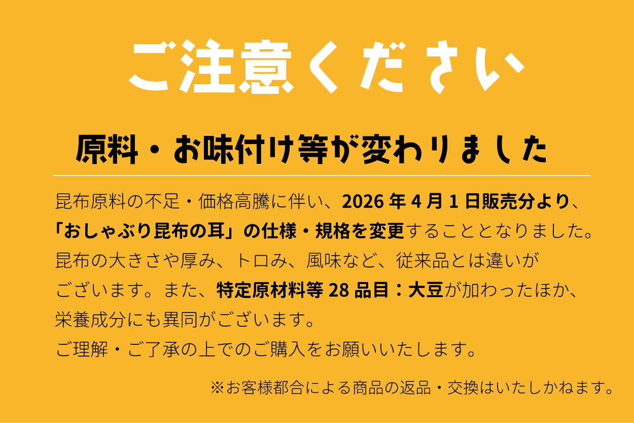 ご好評頂いている「おしゃぶり昆布の耳」ですが、昨今の昆布不漁による原材料不足のため、2026年4月販売分より、原料の一部を変更させていただきます。
