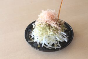 2.お皿に盛った1.に、「さくとろ」・鰹節をたっぷりのせて出来上がり